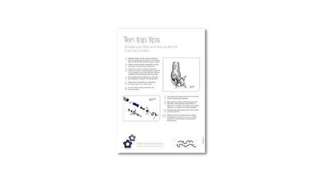 Investing in service before breakdowns occur makes good financial sense. Using Alfa Laval genuine spare parts ensures that existing certificates remain valid while using Alfa Laval service kits and service tools makes maintenance easy. With easy-to-follow service schedules and exploded views of tank equipment, the Alfa Laval Preventive Maintenance Guidelines give you a visual roadmap to maximize productivity and minimize maintenance costs.