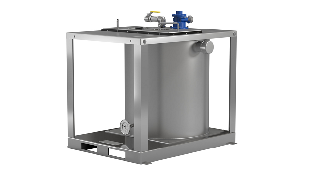 Once the Alfa Laval Vortex Mixmate is filled with fresh water, the 4 hp air motor is switched on to agitate the water. Powdered or pelletized chemicals are then gradually added and robustly mixed into a concentrated solution by the stainless steel impeller. The thermal gauge indicates when the reaction temperature has levelled off and the solution is fully mixed.