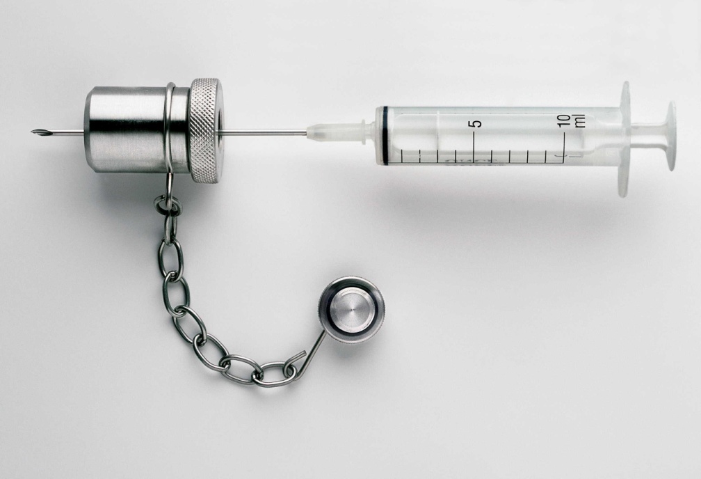 To take a sampling, simply unscrew the closing cap and insert a one-mm hypodermic needle through the rubber plug. This allows for the collection of micro samples, ensuring precise and minimal-volume testing.